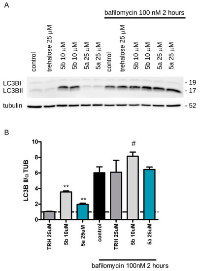 Characterization of the effects of trehalose and NAs 5a and 5b on autophagy. We assessed LC3B conversion upon compound treatment by Western blotting. (A) Evaluation of autophagy induction in HeLa cells treated for 24 h with 25 μM trehalose, 25 μM 5a and 10 μM 5b. During the last 2 h of treatment, we added the known lysosomal blocker bafilomycin (100 nM, 2 h). Upon treatment, we analyzed tubulin and LC3BII levels by Western blotting. (B) The graph shows LC3BII amounts expressed as fold over α-tubulin. Data are expressed as mean ± S.E.; ** p < 0.01 vs. control, # p < 0.05 vs. control + bafilomycin, n = 8–10.