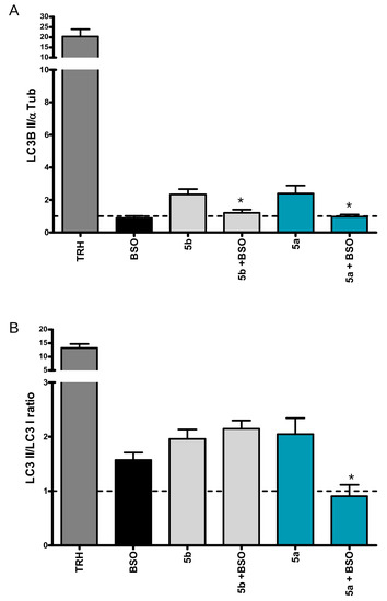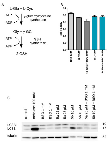 Glutathione (GSH) is the major component of cellular antioxidant systems. Buthionine sulfoximine (BSO) depletes cellular GSH by inhibiting γ-glutamylcysteine synthetase (Figure 6A), a key enzyme in the GSH synthesis pathway [25]. We treated HeLa cells for 24 h with 5b (10 μM) and 5a (25 μM) either alone or in presence of 1 mM BSO. The treatment with BSO neither did affect significantly cell viability per se, nor modified the toxicity profile of our NAs (Figure 6B). Noteworthy, 1 mM BSO significantly impaired the effect of our NAs on the autophagic process by preventing the increase on autophagosome formation induced by 10 μM 5b or 25 μM 5a (Figure 6C and Figure 7A,B).