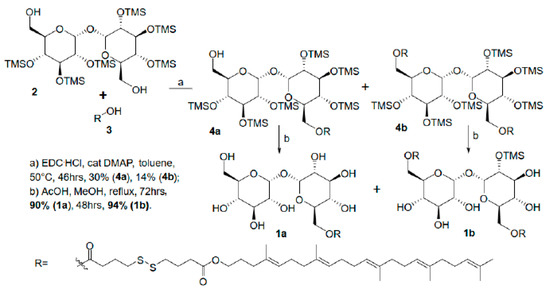 Namely, squalene-dithiolinker carboxylate 3 [20] was coupled in a 1:1 ratio with TMS-protected trehalose 2 [21] (step a, Scheme 1). Both TMS-protected mono-squalenylated 4a and bis-squalenylated trehalose 4b were isolated in poor, unoptimized yields after chromatography. Both intermediates 4a and 4b were deprotected with AcOH in refluxing MeOH (step b, Figure 1), yielding pure 6-squalene-trehalose conjugate 1a and 6,6′-bis- squalene-trehalose conjugate 1b as self-assembling constructs.