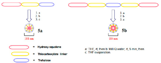 Preparation of 1:1 squalene-trehalose-based (5a, left) and 2:1 (5b, right) squalene-trehalose-based NAs.