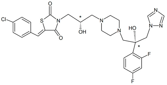 (Z)-5-(4-chlorobenzylidene)-3-(3-(4-(2-(2,4-difluorophenyl)-2-hydroxy-3-(1H-1,2,4-triazol-1-yl)propyl)piperazin-1-yl)-2-hydroxypropyl)thiazolidine-2,4-dione is presented in Figure S1a,b (Supporting Information file), respectively. The step-by-step description of the synthesis process is given just after Figure S1. The respective 1H NMR and 13C NMR spectra were recorded as follows: