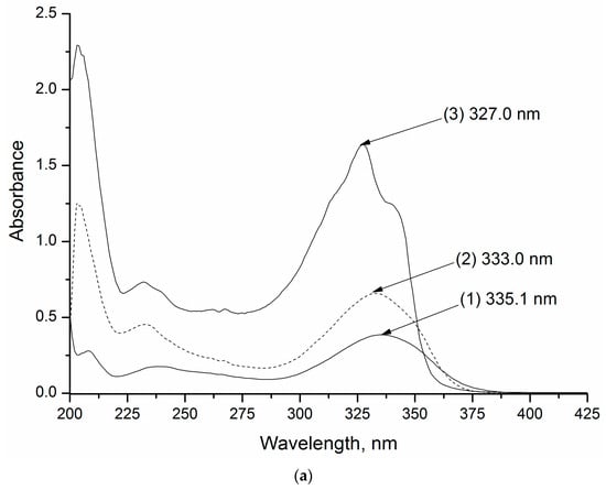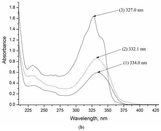 The absorption spectra of RS-186 in pure buffer (1), with 0.05 M 2-HP-β-CD (2) and n-hexane (3); pH 2.0—(a), pH 7.4—(b). Solid lines mean the spectra of pure solvents; dashed lines indicate the spectra of aqueous 2-HP-β-CD solutions.