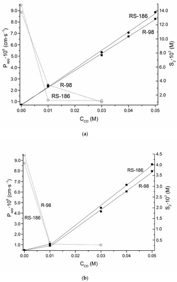Both in acidic medium and at pH 7.4 the permeability, there follows an expected regularity opposed to the solubility: (R-98) < (RS-186) and (R-98) > (RS-186) thus demonstrating a stereoselective and excretive transport. At the same time, only for R-98 the permeability in pH 7.4 where the neutral species of the compound exists exceeds the permeation rate of charged particles in buffer pH 2.0. Unexpectedly, non-typical situation when (RS-186) in acidic solution is slightly higher than in pH 7.4 can possibly be attributed to a less conformational freedom of RS-compound as compared to pure R-enantiomer [45] which disturbs a proper membrane penetration process. A comparative analysis of the influence of CD on the permeation of R-enantiomer and RS-compound (Table 4) revealed that a 9.15- and 8.72-fold permeability reduction occurs up to 0.03 M concentration of CD in donor solution at pH 2.0 for R-98 and RS-186, respectively. Notably, the influence of CD on the permeability decreases in buffer pH 7.4 is practically the same: a 9.66- and 8.89-fold, respectively. According to the approach proposed in [51] the plots illustrating a relationship between the solubility and permeability upon the addition of CD concentrations at both investigated pHs were constructed and depicted in Figure 4. It is well known that the permeability varies over a more narrow range than the solubility does [55] and, expectedly, the permeability decrease can be of orders of magnitude smaller upon a great solubility growth. As it is evident from Figure 4, in acidic medium at 0.01 M CD concentration of R-98 is 2.2-fold higher than for RS-186. In turn, at pH 7.4 this difference is only 1.1-fold. Interestingly, that at 0.03 M CD this difference is smoothed out.