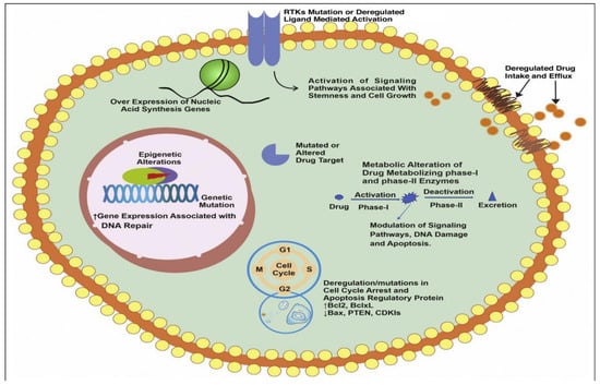 Different underlying mechanisms associated with drug resistance. This figure shows different intrinsic and extrinsic factors responsible for cancer drug resistance starting from alteration of signaling pathways, remodeling of drug efflux pumps expression, overexpression of genes related to cell cycle and apoptosis, enhanced expression of nucleic acid synthesis genes, enhanced DNA repair ability, alteration of drug target sites, alteration in functioning of drug metabolizing enzymes, genetic alternations, and epigenetics. Reproduced from Ref. [], (2022), with permission from Elsevier.