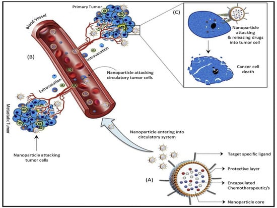 Cancer nanotherapeutics steps: (A) Nanoparticles with a protective layer loaded with chemotherapeutics of interest and decorated with target specific ligand. The drug loaded in the core of the nanoparticle can specifically recognize target cells using target-specific ligands. (B) Nanotherapeutics can reach primary and secondary tumors after entering the circulatory system and target specific tumor cells through the intravasation and extravasation processes. (C) Encapsulated chemotherapeutics are released after binding of tumor specific ligand and target cells surface receptors that causes cellular death. Reproduced from Ref. [], (2022), with permission from Elsevier.
