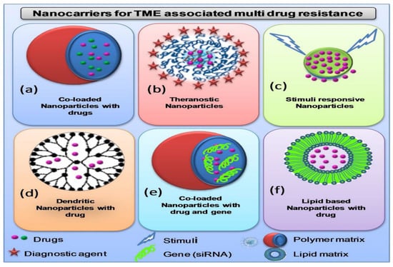 In the last two decades, various other cellular components of TME, such as CSCs, endothelial cells, and stromal cells, were identified and their role in tumor growth is established. All these cellular components vary greatly in terms of size, morphology, and expression of surface receptors, paving the way for us to target these cells individually in order to produce synergistic therapeutic effects []. The advancement of TME-enabled nanotherapy in the past few years demonstrated promising strategies and approaches for the modulation and targeting of TME in combating drug-resistant cancers by limiting disease progression []. Furthermore, a number of novel smart nanoparticles with transformational properties exhibited improved spatiotemporal control over particular tumor microenvironmental targeting. Because of their customizable size, surface coating, and capacity to include a vast number of therapeutic drugs, nanoparticles (NPs) have emerged as a viable platform for TME targeting. Emerging nanocarriers are being utilized for targeting TME and its components include nanoparticles (polymer- and lipid-based), liposomes, polymeric micelles, magnetic nanoparticles, polymer drug and nanoconjugates. A variety of nanocarriers are employed for targeting TME in order to overcome multi-drug resistance (Figure 6).