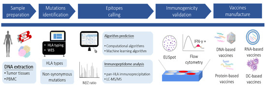 Approaches for identifying neoantigens and proceeding to vaccine manufacture are illustrated in Figure 1, which involve the discovery of the mutanome by next-generation sequencing (NGS), prediction of HLA epitopes by algorithms or mass spectrometry (MS), and functional validation by immunological assays.