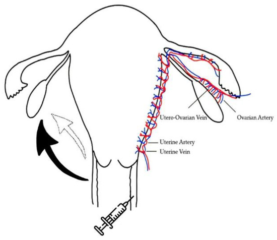 A “first uterine pass effect” was suggested two decades ago, when steroid hormones were delivered through the vagina [7,8,9]. Delivery of progesterone supplements via the vagina compared to delivery of similar medication via the conventional intramuscular route showed up to 10× higher circulating levels of progesterone [10,11,12,13]. Blood circulation is a crucial mechanism of the “first uterine pass effect,” and the large surface area and blood supply of the vaginal epithelium allows for more efficient systemic drug delivery of peptides and other therapeutic macromolecules [3,14]. This mechanism is based on the countercurrent exchange via vein-to-artery diffusion of the uterine arteries in the upper vagina. These characteristics opened a wider door for the administration of medicine, with a special focus on the treatment of uterine disorders, as well as the enhancement of ovarian folliculogenesis.