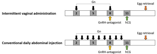 Schematic expression of gonadotropin (Gn) administration. The Gn was given on days 2, 5, and 8 for intermittent vaginal administration, in comparison to conventional abdominal injections that are performed daily starting on menstrual day 2. GnRH (Gn-releasing hormone) antagonist was given when the leading follicle reached 12–14 mm in diameter, which was mostly noted at day 8 of the cycle. hCG: human chorionic gonadotropin.