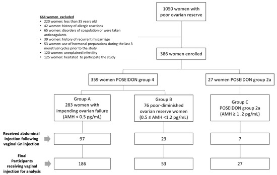 We approached women who had requested IVF treatments from January 2016 to December 2020. Only those POR women receiving IVF treatments were included as the study group. The inclusion criteria were POSEIDON groups of infertile women aged over 35 years with a body mass index (BMI) of 17.0–28.0 kg/m2. The exclusion criteria included history of allergic reactions, history of recurrent miscarriages, coagulation disorders, use of hormonal preparations in the last 3 menstrual cycles, and—last but not least—unexplained infertility. Women were categorized into three groups based on the initial serum AMH serum level: Group A women with impending ovarian failure (AMH < 0.5 ng/mL); Group B women with poor-to-diminished ovarian reserve (0.5 ≤ AMH < 1.2 ng/mL) (Groups A and B belonged to POSEIDON group 4); and Group C women (AMH ≥ 1.2 ng/mL) (POSEIDON group 2a).