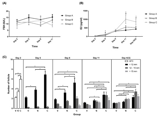 Levels of (A) FSH, (B) E2, and (C) follicles. All data presented as mean ± SEM. + The p-value difference was significant between Group C and Group A. # The p-value difference was significant between Group B and Group A. * p < 0.05. Group A: AMH < 0.5 ng/mL; Group B: 0.5 ng/mL ≤ AMH < 1.2 ng/mL; Group C: AMH ≥ 1.2 ng/mL.