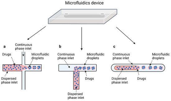 It is crucial to produce monodispersed microparticles with uniform size and morphology, in order to have precise control of the release of the drug. To meet these requirements, many efforts have been made to generate droplets with controlled sizes and shapes using traditional methods, such as layer-by-layer assemblies [88], precipitation [89], spray-drying [90], and phase separation. However, these conventional techniques produce drug carriers that have large polydispersity in size, high variability in structure, and a wide range of encapsulation efficiencies. For these reasons, alternative technologies need to be considered to produce highly controlled emulsions. By using a microfluidic platform, it is possible to generate and manipulate droplets that meet the sophisticated requirements in biomedical applications. Microfluidic devices allow the control of fluids at micro and nanometric scales and the precise tuning of the composition and geometrical characteristics of generated microparticles [7,12]. In particular, by regulating the channel geometry and flow rates, microparticles of reproducible and tailored sizes can be obtained [91]. Since monodispersed droplets are usually made by emulsifying two immiscible fluids, the microfluidic chips exploit the flow focusing between a continuous (usually oil) and a dispersed phase (usually water) [7]. When the continuous phase meets the dispersed one, the difference in terms of surface tension leads to the formation of drops. The continuous phase acts as a carrier for the dispersed one, and for that purpose it should contain a surfactant to make the emulsion stable. The size of the microdroplets can be controlled by varying the ratio between the volumetric flow rates of the two phases [91].