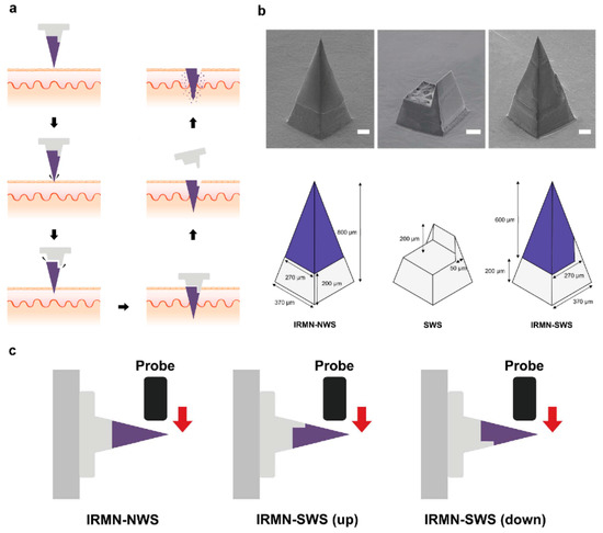 (a) Schematic illustration of insertion-responsive microneedles. (b) Describing the dimensions of different structures. (c) Schematic illustration of the transverse compression test. Reprinted from [108] 2018, Royal society of chemistry.