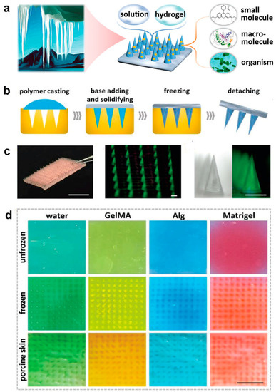 - Zhang, X.; Fu, X.; Chen, G.; Wang, Y.; Zhao, Y. Versatile Ice Microneedles for Transdermal Delivery of Diverse Actives. Adv. Sci. 2021, 8, 2101210. [Google Scholar] [CrossRef]