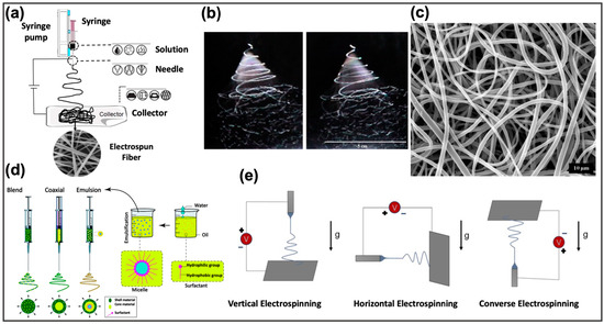 (a) Schematic representation of a classical electrospinning system. Reprinted from Fadil et al. [119], with permission under Polymers license. (b) Stroboscopic image of a polymeric jet, generated during electrospinning. Reprinted from [120] with permission under Polymer. (c) SEM image of the generated polymeric nanofibers. Reprinted from [120] with permission under Polymer. (d) Representation of the resulting nanofiber structures from different polymer feed solutions loaded for the electrospinning. Reprinted from Nikmaram et al. [121] with permission under RSC license. (e) Schematic representation of the impact of gravity on the resulting nanofibers in different orientations of the electrospinning system. Adapted from Nagam et al. [122] with permission under Fibers license.