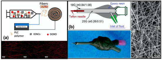 Recently, a specific electrospinning method was developed in [137] to produce polycaprolactone (PLC) nanofibers loaded with magnetic nanoparticles, used as thermal mediators selectively activated under an alternating magnetic field. The aim of the work was to combine the chemotherapy with magnetic hyperthermia to maximize the effect of the treatment. Specifically, magnetic iron oxide nanocubes (IONCs) and doxorubicin (DOXO) hydrochloride were added to a PCL solution in chloroform obtaining drug-loaded magnetic fibers (Figure 7a). The magnetic properties of these new nanofibers showed an increase in the temperature profile in the presence of a safe magnetic field, which in combination with the drug, ensured an improvement of the cytotoxic effects.