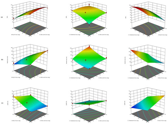 Response surface 3D plot for the effect of oleic acid (X1), Brij 35 (X2), and cholesterol (X3) concentrations on (a) EE% (Y1), (b) vesicle size (Y2), and (c) Q24h (Y3).