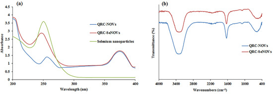 (a) UV–Vis spectra of QRC-NOVs, QRC-SeNOVs, and selenium nanoparticles; (b) FT-IR spectra of QRC-NOVs, and QRC-SeNOVs.