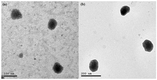 TEM investigation is a valuable tool for exploring the shape, lamellarity, and size of nanovesicles [70]. TEM micrographs of the optimal QRC-NOVs and QRC-SeNOVs are clarified in Figure 3. The speculated vesicles were nanostructured, spherically shaped, unilamellar, non-aggregating vesicles with uniform size distribution. The photomicrograph of QRC-SeNOVs revealed a slight increment in vesicle size elucidating the adsorption of selenium coat, which appeared as a very thin layer surrounding the NOVs shell as shown in Figure 3b. Moreover, the average vesicles size attained via TEM analysis was in harmony with that measured by DLS.