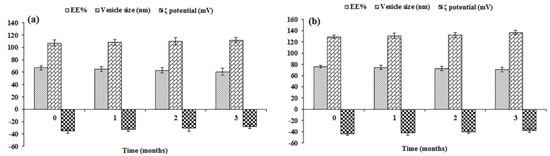To inspect the physical stability of the optimum QRC-NOVs, and QRC-SeNOVs, both formulations were stored for three months in glass vials at refrigeration temperature (4 ± 1 °C). The characteristics of the formulations were examined at predetermined intervals (0, 30, 60, and 90 days). Samples from each formulation were withdrawn, and then estimated for their physical appearance, EE%, vesicle size, and ζ potential. The analyses were performed in triplicate, and the mean values ± SD were narrated [23].