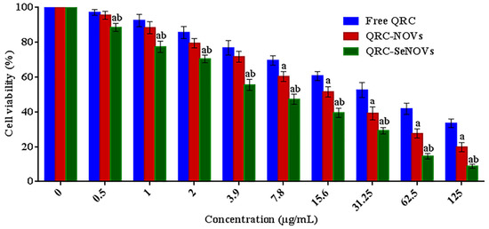NOVs, free fatty acid-enriched vesicles, are anticipated to have greater diffusion across the biological membranes and hasten the tumor uptake of the laded drug. Also, NOVs can exert passive accumulation in the tumorous tissues through the enhanced permeability and retention (EPR) impact, though they may be succumbed to fast elimination as a result of complement conjugation and phagocytosis via the reticuloendothelial system (RES) [16,17]. The small circulatory half-life of common vesicles mitigates the EPR influence; thus, extensive effort is mandatory for enhancing the in vivo bio-fate of such conventional vesicles. In this perspective, we hypothesized that selenium-plated NOVs (SeNOVs) can be suggested as an auspicious strategy to upgrading the architecture of NOVs, strengthening their plasma stability, as well as potentiating the anticancer effect of QRC.