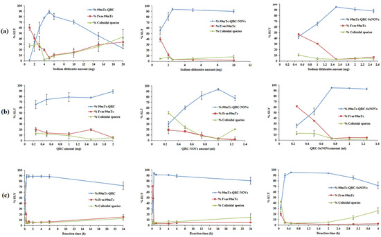 QRC solution, QRC-NOVs, and QRC-SeNOVs were radiolabeled by technetium-99m (99mTc) adopting the simple reducing method utilizing sodium dithionite [14]. The impact of sodium dithionite amount (0.5–20 mg), QRC amount (QRC solution or QRC nanodispersions equivalent to 0.25–2 mg), and incubation time (0.08–24 h) on radiolabeling efficacy was investigated to accomplish the optimal reaction conditions, then approximately 100 μL of the 99Mo/99mTc generator eluate comprising 7.2 MBq of 99mTcO4− was introduced each time. Only one factor was varied while the other factors were held constant, where each experiment was repeated thrice, and the results were reported as mean ± SD. The optimum radiolabeled-drug complex was inspected for in vitro stability.