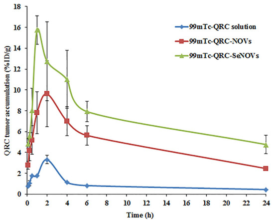 The aim of this work was to investigate the potential of NOVs for systemic delivery of QRC via hybrid platform based on selenium for tuning QRC pharmacokinetics and tumor targeting. Adopting Box–Behnken design, the influences of NOVs formulation variables on drug entrapment, vesicle size, as well as the in vitro release were scrutinized. Then, QRC-SeNOVs were assembled through electrostatic complexation/in situ reduction method based on the optimum NOVs formulation, and both of them were tested against human rhabdomyosarcoma (RD) cells versus crude QRC. Furthermore, QRC was radiolabeled utilizing technetium-99m (99mTc) to assess its pharmacokinetics and biodistribution after intravenous (i.v.) administration of the tailored 99mTc-QRC-SeNOVs to Ehrlich tumor-bearing mice and compared to i.v. 99mTc-QRC-NOVs and i.v. 99mTc-QRC solution.