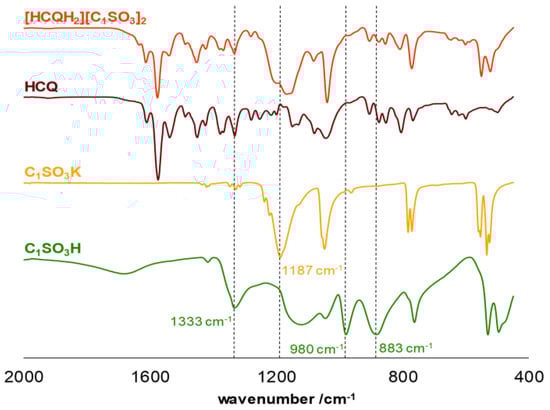 The FTIR spectra of the prepared HCQ-ILs (Figures S1–S7) supported the full ionization of the organic acids. In the case of compound 9, the presence of a carboxylate stretching band at 1578 cm−1 and the absence of one at ca. 1730 cm−1, corresponding to the stretching of the carboxylic acid group, confirms the complete ionization of this HCQ-IL. In the case of the sulfonate-containing ILs 3–7, similar vibrational profiles within the 1350–850 cm−1 fingerprint zone were observed between the starting anion salts and corresponding products, which were strikingly different for HCQ and corresponding acids. Hence, this corroborated the presence of the anions and cations as ionized species. Figure 1 depicts a comparison of the FTIR spectra of [HCQH2][C1SO3]2 (3), hydroxychloroquine (2), potassium methanesulfonate (C1SO3K) and also methanesulfonic acid (C1SO3H). In more detail, the bands at 1333, 980 and 883 cm−1 are characteristic of non-ionized methanesulfonic acid, as they are absent from the spectra of the remaining compounds. In addition to the absence of these bands, the FTIR spectra of product 3 contains a band that appears at 1187 cm−1 in the spectrum of potassium methanesulfonate, ascribable to the stretching of the sulfonate group. Hence, these data indicate the ionization of methanesulfonic acid upon combination with hydroxychloroquine.