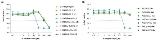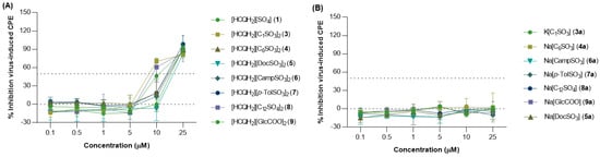 In order to assess the biocompatibility of the compounds under study, cytotoxicity assays were performed on Vero E6 cells, which are the gold standard for SARS-CoV-2 propagation studies. As shown in Figure 2A, the majority of the HCQ-ILs displayed a similar cytotoxic profile to the parental drug, possessing CC50 values ranging from 196.0 to 218.7 μM (CC50 (1) = 214.4 μM) (Table 4).