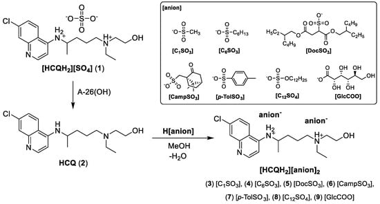 The synthesis of the HCQ-ILs was performed by the dropwise addition of the selected organic acids to a hydroxychloroquine base (HCQ), in an analogous fashion to previous works with other drugs (e.g., fluoroquinolones [51]). HCQ was previously prepared by passing hydroxychloroquine sulfate ([HCQH2][SO4], 1), the commercial form of HCQ, through the hydroxide exchange resin Amberlyst A-26 (OH). The obtained HCQ free base (2) was subsequently protonated at the alkyl secondary and tertiary amines in aqueous media with two equivalents of five sulfonic acids, one sulfuric acid and one carboxylic acid based on the following anions: methanesulfonate [C1SO3] (3), hexanesulfonate [C6SO3] (4), docusate [DocSO3] (5), (1S)-(-)-10-camphorsulfonate [CampSO3] (6), p-toluenesulfonate [p-TolSO3] (7), dodecylsulfate [C12SO4] (8) and gluconate [GlcCOO] (9). Some of the organic acids were prepared from the corresponding sodium salts by previously undergoing ion exchange via the cationic resin Amberlite 15(H+). Scheme 1 shows the employed synthetic methodology.