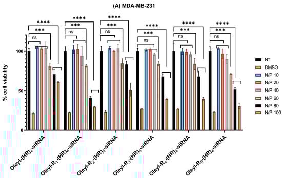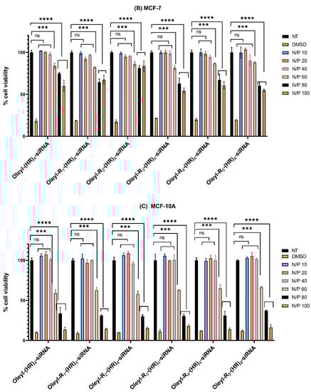 (A) Cytotoxicity of peptide/siRNA complex in MDA-MB-231 cells (B) Cytotoxicity of peptide/siRNA complex in MCF-7 cells (C) Cytotoxicity of peptide/siRNA complex in MCF-10A cells. Incubation time in each assay was 48 h. Graphs represent mean normalized values (based on No Treatment or NT group; n = 3). ns means nonsignificant. (if p < 0.001 then ***, if p < 0.0001 then ****). Error bars indicate standard deviation. Thirty-five percent v/v DMSO served as a positive control.