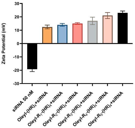 Zeta potential is an important technique in determining surface charge on the complexes and evaluating the complexes’ degree of aggregation in the solution. The zeta potential was determined using Malvern Nano ZS Zetasizer for each peptide-siRNA complex, as shown in Figure 2 below. siRNA concentration in each of the complexes was 50 nM, whereas the peptide concentration varied with the amount of ionizable nitrogen. N/P ratio for each complex was chosen as 40. The data indicates the peptides-siRNA complexes show an overall positive zeta potential ranging from +10 mV to slightly over +20 mV. With an increase in arginine residues, the zeta potential value increased. The surface charge of the complexes could affect their interaction with the cell membrane and, therefore, their cellular internalization. The positive zeta potential values indicate the stability of the complexes [], and possibly favorable interaction with cell membranes, which are important attributes for a successful siRNA delivery system.