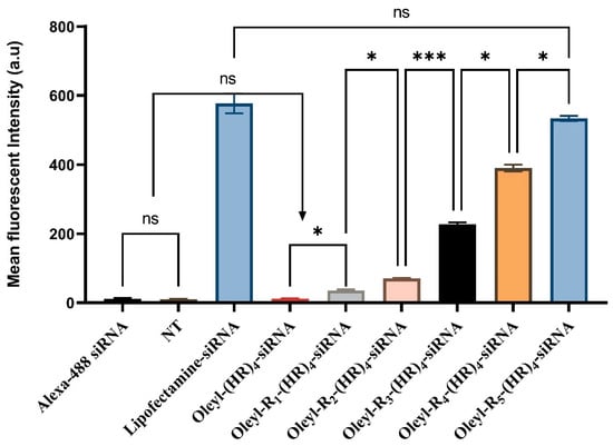 Cellular internalization of oleyl conjugated-siRNA complexes in MDA-MB-231. Bars indicate the mean fluorescent intensity of Alexa fluor-488 labeled siRNA. The error bars indicate ± SD (n = 3), ns means nonsignificant, * indicates p-value < 0.05, *** indicate p-value < 0.001.