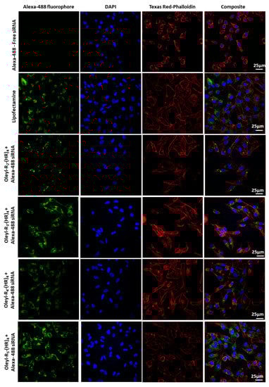 Confocal microscopy is an essential technique for qualitatively visualizing the cellular internalization of fluorophore-conjugated siRNA. As mentioned earlier in Section 2.7, there have been reports for using fixed cells [,,,] or live cells [] for imaging the cellular uptake of siRNA. We performed microscopy in the fixed cells as reported by Aliabadi et al. []. After treatment, rigorous washing of cells was performed to ensure complete elimination of any peptide:siRNA complexes on the cell surface before fixing the cells and subsequent staining to visualize the cellular uptake of siRNA in the cells. Free siRNA (with no peptide) was used as a negative control, whereas the commercial transfection reagent Lipofectamine 2000 was used as a positive control. The confocal microscopy results (Figure 4) corroborate the quantitative data obtained by flow cytometry (Figure 3). Oleyl-R4-(HR)4 and Oleyl-R5-(HR)4 showed a comparable green fluorescence (Alex-488 fluorophore), representing that these peptides show promise in delivering siRNA efficiently into the MDA-MB-231 cells.