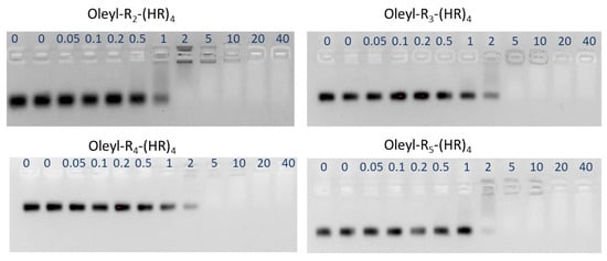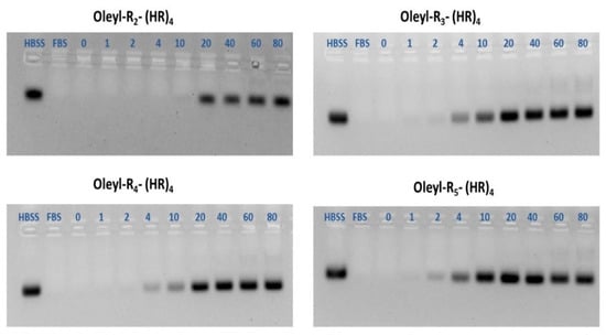 Representative images of gel retardation assay for evaluating binding affinity of the oleyl conjugated peptides with the siRNA.
