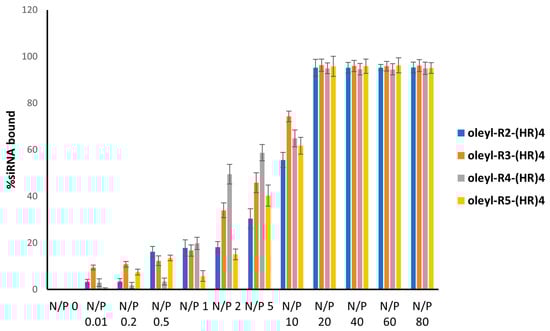 Gel retardation assay of oleyl-conjugated peptides/siRNA complexes at N/P ratios ranging from 0 to 80. The bars indicate the mean intensity of the bands, representing percent siRNA bound to the peptides, quantified by Image Lab software. Error bars show the standard deviation (n = 3).