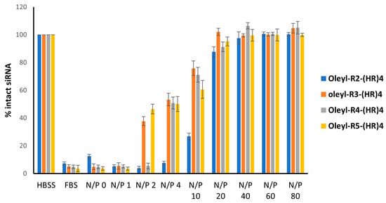 Gel retardation assay of oleyl-conjugated peptides/siRNA complexes after 24 h exposure to 25% v/v FBS and dissociation of complexes using heparin competition assay at N/P ratios ranging from 0 to 80. The bars indicate the mean intensity of the bands, representing percent siRNA bound to the peptides, quantified by Image Lab software. Error bars show the standard deviation (n = 3).