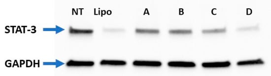 Western blot image of STAT-3 protein silencing in MDA-MB-231 cells. Where GAPDH served as a house-keeping protein; [NT = Nontreated Cells, Lipo= Lipofectamine 2000, A = Oleyl-R2-(HR)4, B = Oleyl-R3-(HR)4, C = Oleyl-R4-(HR)4, D = Oleyl-R5-(HR)4].