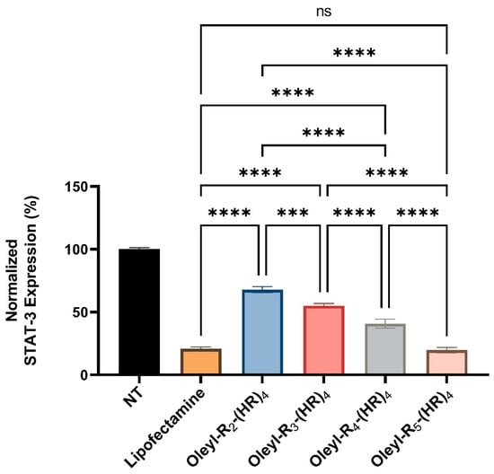 Normalized STAT-3 expression quantified from the Western blot after 48 h of treatment with oleyl conjugated peptides-siRNA complexes at N/P 40. ns means nonsignificant, *** indicates a p-value < 0.001, and **** indicate a p-value < 0.0001.