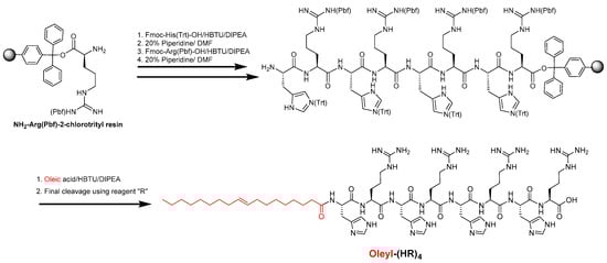 Peptides in Table 1 were synthesized using Fmoc/tBu solid-phase peptide chemistry as depicted in Scheme 1 with the representative synthesis of oleyl-(HR)4 peptide. All the peptides were characterized by MALDI-TOF mass spectroscopy (Table 1) and purified using RP-HPLC. The analytical HPLC showed a purity of ≥95%. The spectra of mass data, as well as the purity data of the synthesized conjugates, are provided in the Supplementary Information (Figures S1–S12).