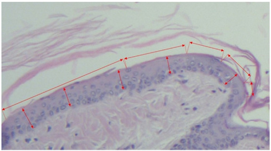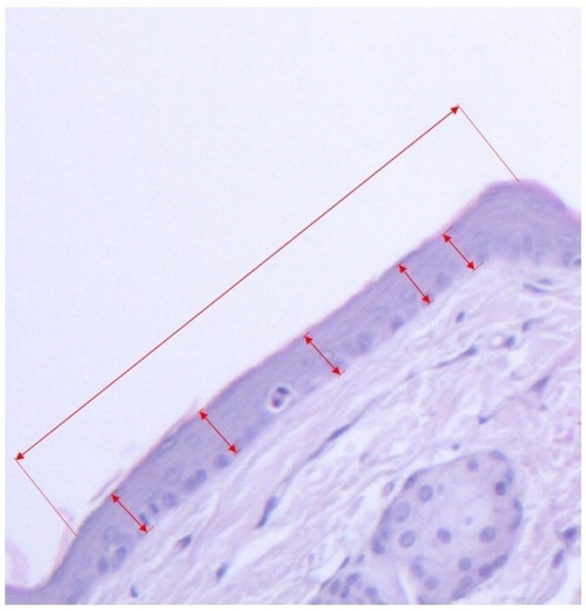 - Mean epidermal thickness of the individual scale (between two pilous follicles). For mean epidermal thickness, 5 measurements were made in each of the 10 scales, resulting in 300 measurements per group. The dimensions were calculated in micrometers.