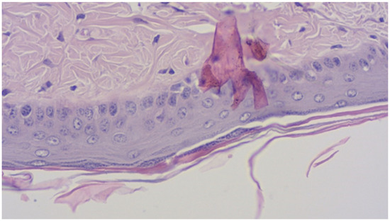 Figure 3. Section group treated with 0.1 milliliter celecoxib 2% applied in the proximal part of the tail. The granular layer extends on the whole length scale, hematoxylin–eosin staining, 10× objective. - B.