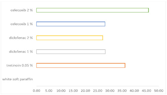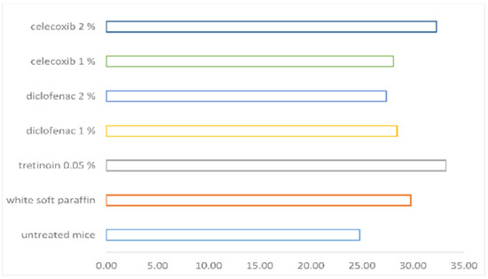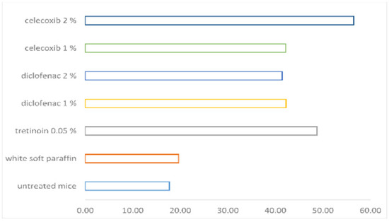 The order regarding the mean epidermal thickness was: tretinoin 0.05% > celecoxib 2% > white soft paraffin > diclofenac 1% > celecoxib 1% > diclofenac 2% > untreated mice (see Table 1; see Figure 6).