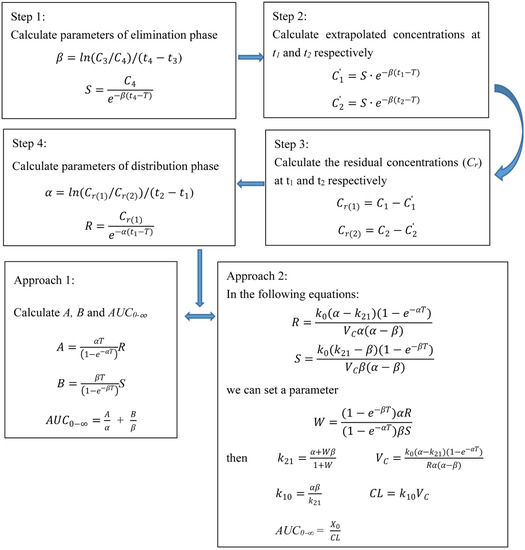 The parameters for k21 and VC can be calculated by Equations (2) and (3). The following equations can be used to calculate the AUC0–∞.