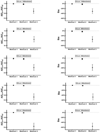 Ratio of AUC0–∞: AUCref (left panel) and Bias (right panel) calculated using three methods in patients with various degrees of renal function (CLcr value: 100, 60, 50, 35 and 25 mL/min). Data is presented as mean and SD. The solid circle, square, triangle represent the mean value of AUC0–∞: AUCref (left) or Bias (right) using Method 1, Method 2, and Method 3, respectively.