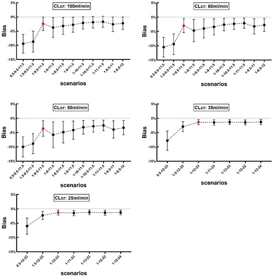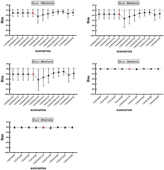 The effect of changing sampling time on bias for AUC0–∞ calculated using Method 1 in patients with various degrees of renal function (CLcr: 100, 60, 50, 35, 25 mL/min). Red solid circle represents the mean bias when the four sampling time points set per the schedule, namely 1.5, 2.5, 9.5 and 11.5 h post the initiation of intravenous infusion of vancomycin. Black solid circle represents the mean bias with changing one scheduled sampling time while other three remain unchanged. X axis represents respective sampling time schedule for each patient, for example, 1-2.5-9.5-11.5 represents that the four sampling time points set at 1, 2.5, 9.5 and 11.5 h post the initiation of intravenous infusion of vancomycin. Data is presented as mean and SD.