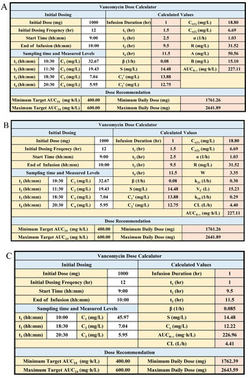 We built three dose calculators using Microsoft Excel based on the PK equations for Method 1 and Method 2 approaches. The equations were embedded in the Microsoft Excel. The subsequent dosing regimen for the 3rd or 4th dose can be adjusted automatically after inputting the patient information, sampling times and their corresponding plasma vancomycin levels.