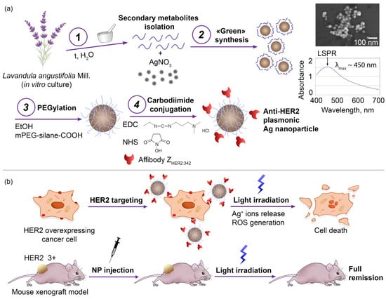Experimental design of Ag NP synthesis and modification for the HER2-targeted photothermal therapy in vitro and in vivo. (a): “Green” nanoparticle synthesis via the reduction of silver nitrate with Lavandula angustifolia Mill. secondary metabolites (1–2), modification of NP surface with scaffold polypeptide—affibody ZHER2:342 through the intermediate PEGylation (3), and carbodiimide conjugation (4). Electron micrographs of Ag NPs, obtained by SEM (scale 100 nm). Absorbance spectra of Ag NPs indicate the presence of an LSPR peak. (b): Photothermally-induced death of HER2-overexpressing cancer cells in vitro mediated by the targeted delivery of modified NPs to specific cells and subsequent light irradiation, leading to Ag NP heating, Ag+ ions release, and ROS generation. in vivo xenograft tumor photothermal therapy with targeted Ag NP injections and external irradiation of the tumor site, leading to the full tumor and metastasis elimination.