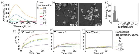 Synthesis, characterization, and optical and photothermal properties of Ag NPs. (a): Absorption spectra of NPs in the wavelength range of 350–800 nm, obtained by spectrophotometry during the 240 min incubation of an aqueous solution of silver nitrate (1 g/L) and plant extract at 0.5–30% concentrations. (b): Electron micrographs of Ag NPs obtained by scanning electron microscopy (scales, 100 nm). (c): Histograms of the distribution of NP number (%) by size (nm). (d): Dynamics of temperature change (°C) of different NP concentrations (g/L) under the irradiation with a LED matrix at a power of 95, 75, and 34 mW/cm2.