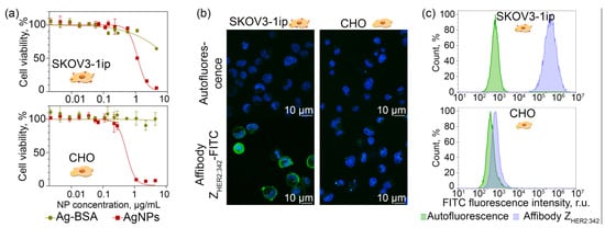 Protein-mediated shielding of Ag NP cytotoxicity. Affibody ZHER2:342 cell labeling. (a): MTT assay results of the SKOV3-1ip and CHO cells viability (%) depending on the concentration of unmodified Ag NPs and BSA-modified Ag-BSA NPs in the medium (µg/mL). (b): Confocal microscopy of HER2-overexpressing SKOV3-1ip and HER2-negative CHO cells labeled with ZHER2:342-FITC. (c): Flow cytometry histograms of SKOV3-1ip and CHO cells showing the cell interaction with ZHER2:342-FITC. Green—cell autofluorescence, blue—cells labeled with affibody.